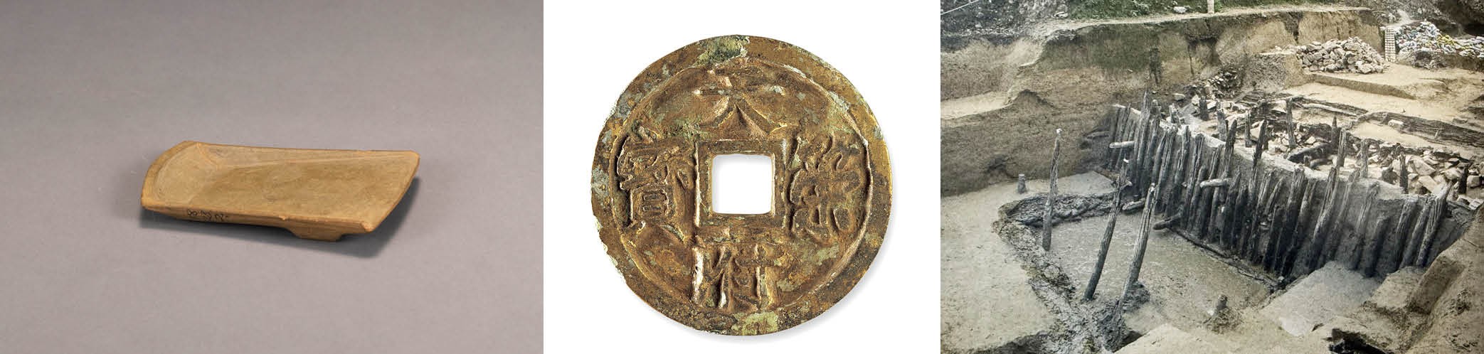 左图:“长兴三年”石砚,“长兴”为五代后唐明宗李嗣源年号,砚底刻有“张师进记”及“长兴三年三月内将钱壹仟五佰文买之”铭文。中图:“天策府宝”鎏金铜钱,五代十国时期的货币。右图:杭州平安里吴越国捍海塘遗迹。