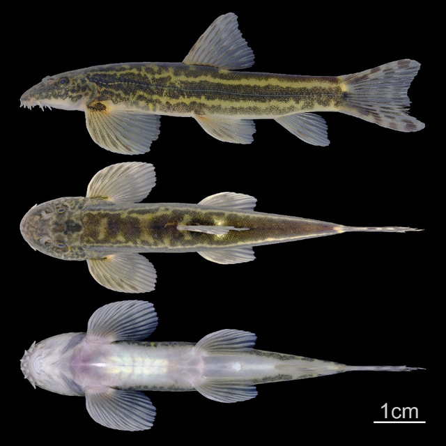 盘问团队通过分子系统发育分析和方式学比对,新发现九龙江种群与此前花尾缨口鳅互异显贵。遗传分析显现,两者间的最小遗传距离达4.16%,突出缨口鳅属内大宗已定名物种间的互异水平。在方式学上,新物种具有特有的双排型吻须、带条纹的浅凹形尾鳍,以及沿侧线漫衍的无边深色纵向条纹等特征。