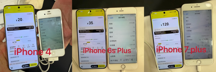 爱回收报价:iPhone 4 16GB为20元;iPhone 6s Plus 128GB为35元;iPhone 7 Plus 128GB为120元。