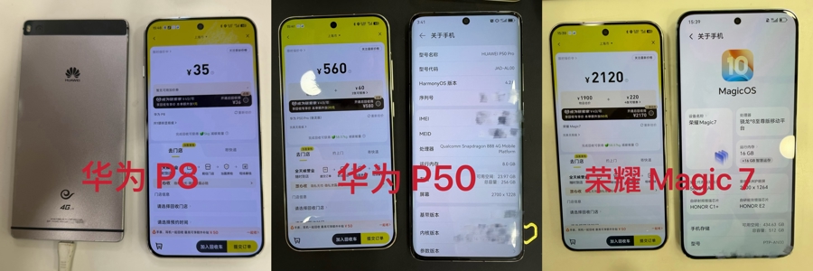 爱回收报价:华为P8 16GB为35元;华为P50 Pro 256GB为560元;荣耀Magic7 512GB为2120元。
