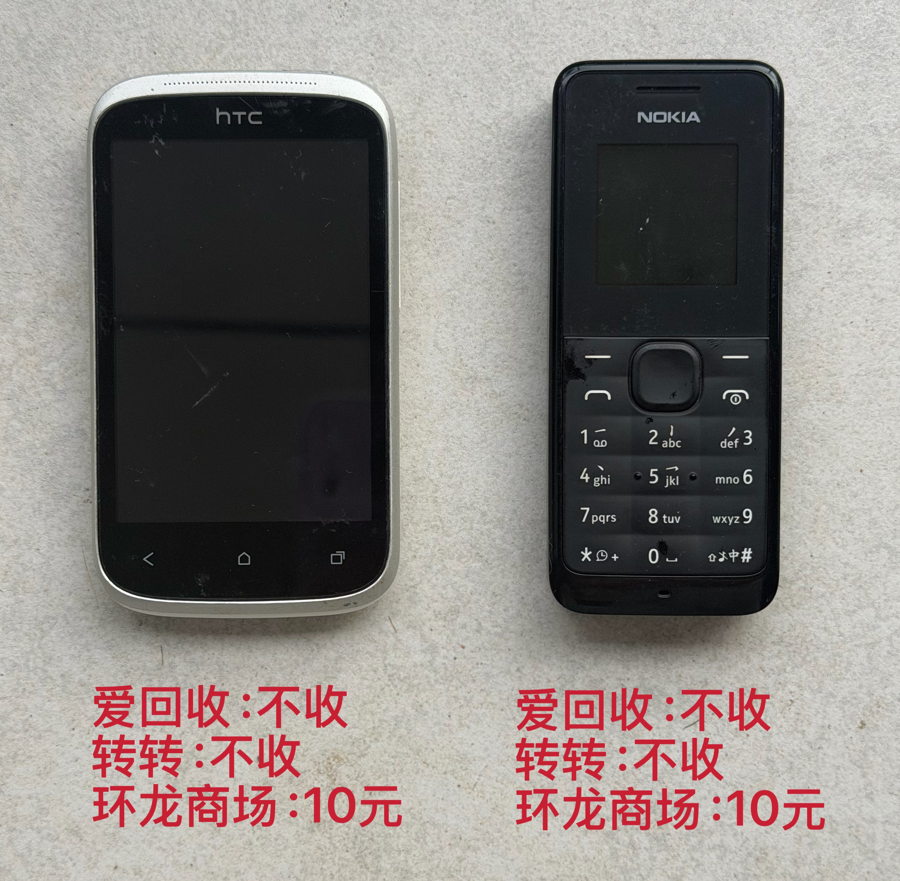 无法开机的诺基亚和htc手机,爱回收和转转都不收;在环龙阛阓有个别商家称10元可收。