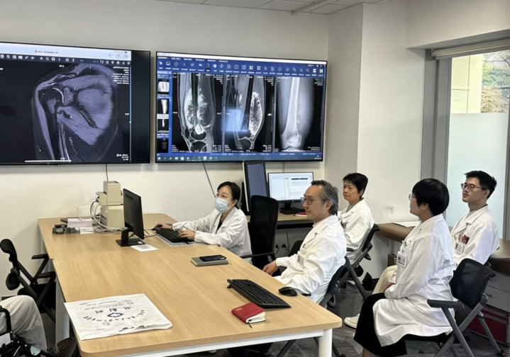 在上海市第六东谈主民病院骨与软组织肿瘤整合门诊,杨庆诚讲授团队在为患者看病。上海市第六东谈主民病院供图