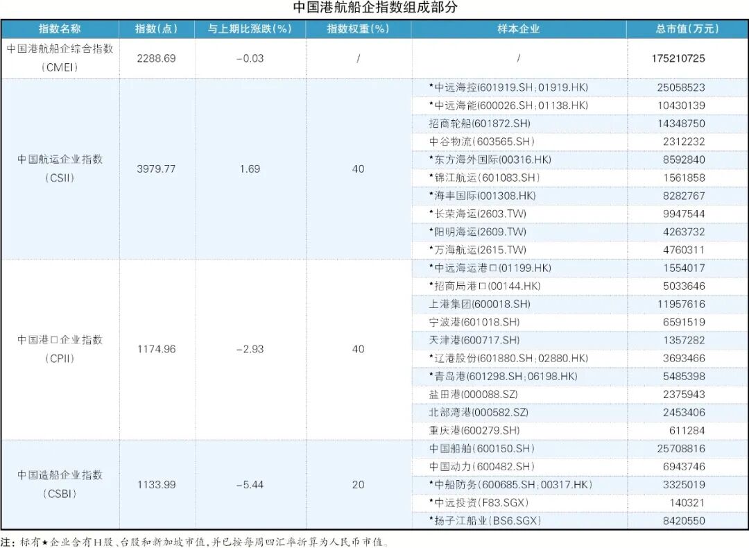 本周,航运板块市值加多149.06亿元;口岸板块市值减少124.06亿元;造船板块受中国船舶下落影响市值减少256.34亿元,环比下落5.44%。